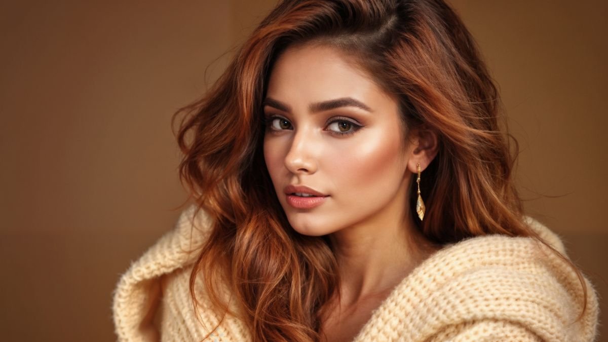 Apply a matte base, bronze highlighter, and cinnamon brown contour to sculpt your features. Glossy nude lips add a chic touch, perfect with soft curls or a voluminous bun.