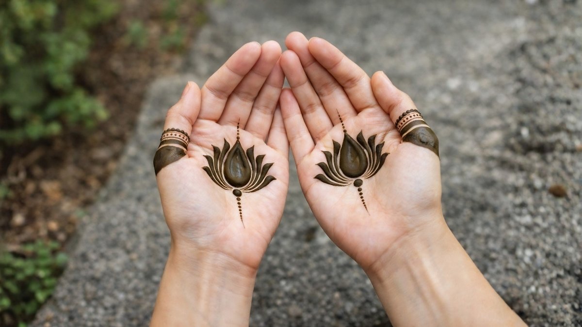 A simple lotus mehndi design with a single bloom, thin outlines, and minimal shading works best for beginners. Small wrist motifs or finger lotus patterns are easier to draw and maintain symmetry.