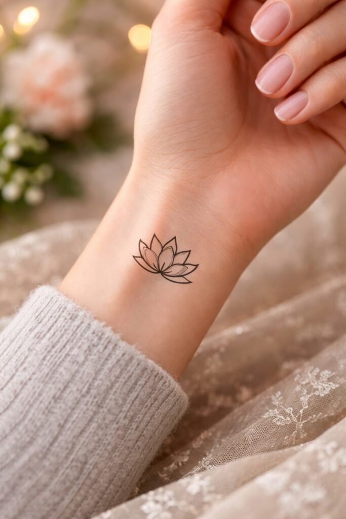 Minimal back-hand lotus henna art features a single blooming flower with subtle shading and fine petal detailing, accented by tiny leaves. Modern simplicity meets cultural grace. The lotus represents purity and resilience.