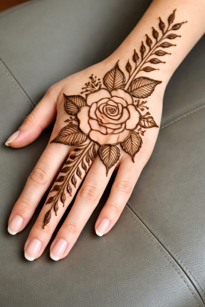 A graceful rose motif mehndi unfolds with shaded petals at the palm center, vines curving elegantly to the fingertips with tiny bud accents for subtle romance. Modern Arabic flow emphasizes breathable negative space and light sophistication.