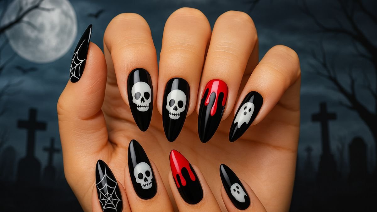 Add Halloween touches like spider webs, pumpkins, ghosts, bats, or blood drips. Using matte finishes, glitter, or glow-in-the-dark polish also enhances the effect.