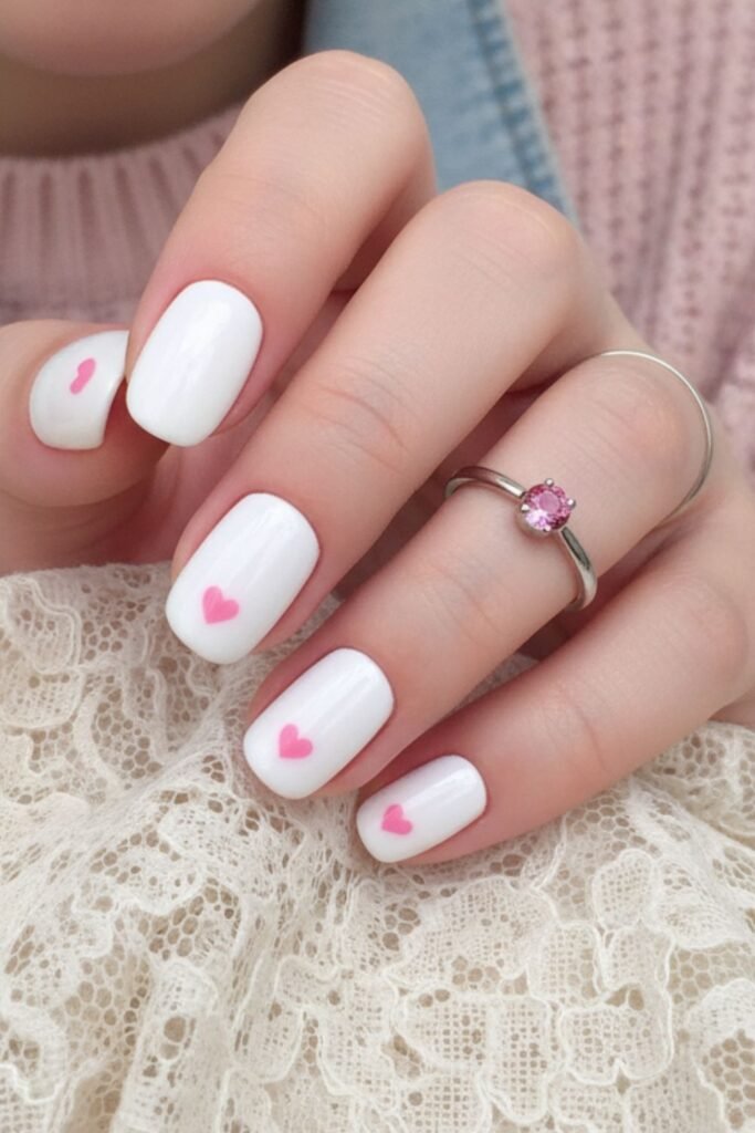 White glossy nails decorated with tiny pink hearts feel angelic and feminine. These short oval nails feature delicate heart accents placed neatly near the tips for a balanced romantic manicure. This design fits into simple heart nail designs and love themed nails effortlessly.