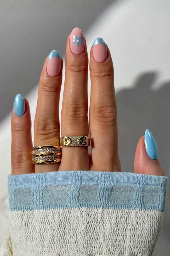 A playful take on the classic French manicure, this design features soft blue tips paired with delicate floral accents. The contrast between the blue and the pastel background gives it a modern twist, perfect for Easter.