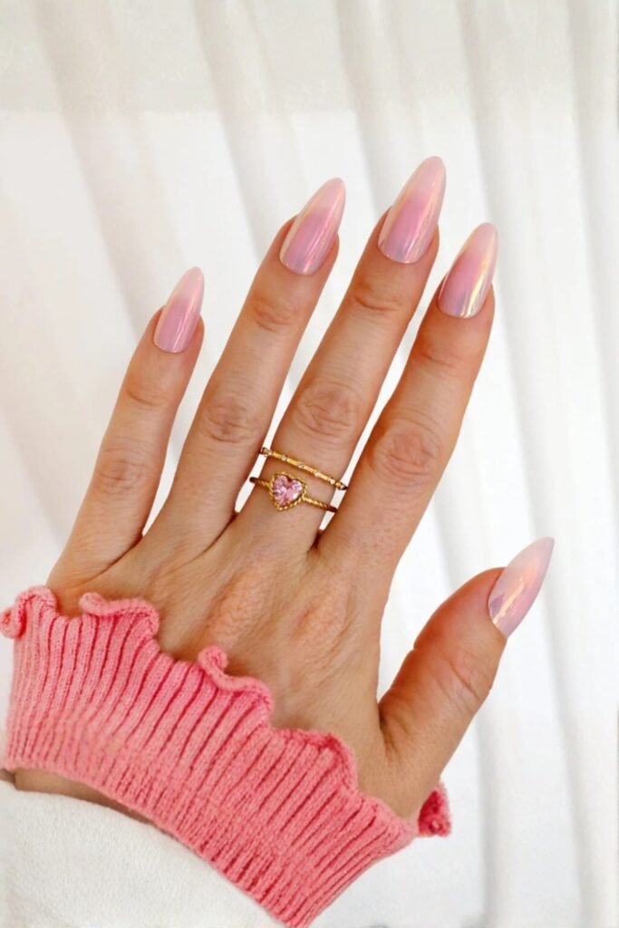 Bubblegum donut glaze nails add a touch of whimsy with a smooth pastel base topped with a glossy, iridescent finish. The look feels sweet and fun, with a slight shimmer that brings the pastel color to life.