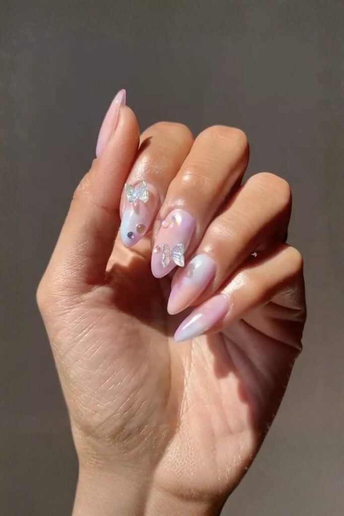 For a unique Easter look, consider adding a soft gradient with pastel rainbow daisies or the whimsical butterfly decals to your nails. These two styles strike the perfect balance between charm and sophistication, making them ideal for both casual and formal Easter gatherings. Celebrities like Zendaya and Hailey Bieber have embraced similar nail designs, proving that chic, subtle ombré is always in style.