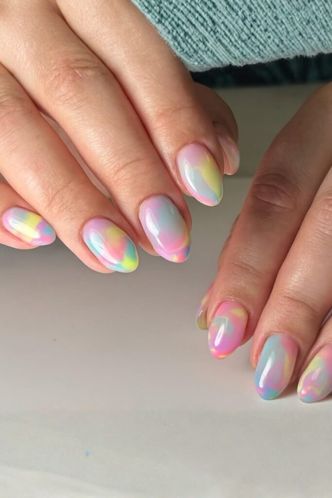 Pastel marble nails combine the serene beauty of pastel shades with a swirling marble effect, amplified by the cat eye shimmer. The soft blend of colors gives an artistic, airy feel perfect for springtime.