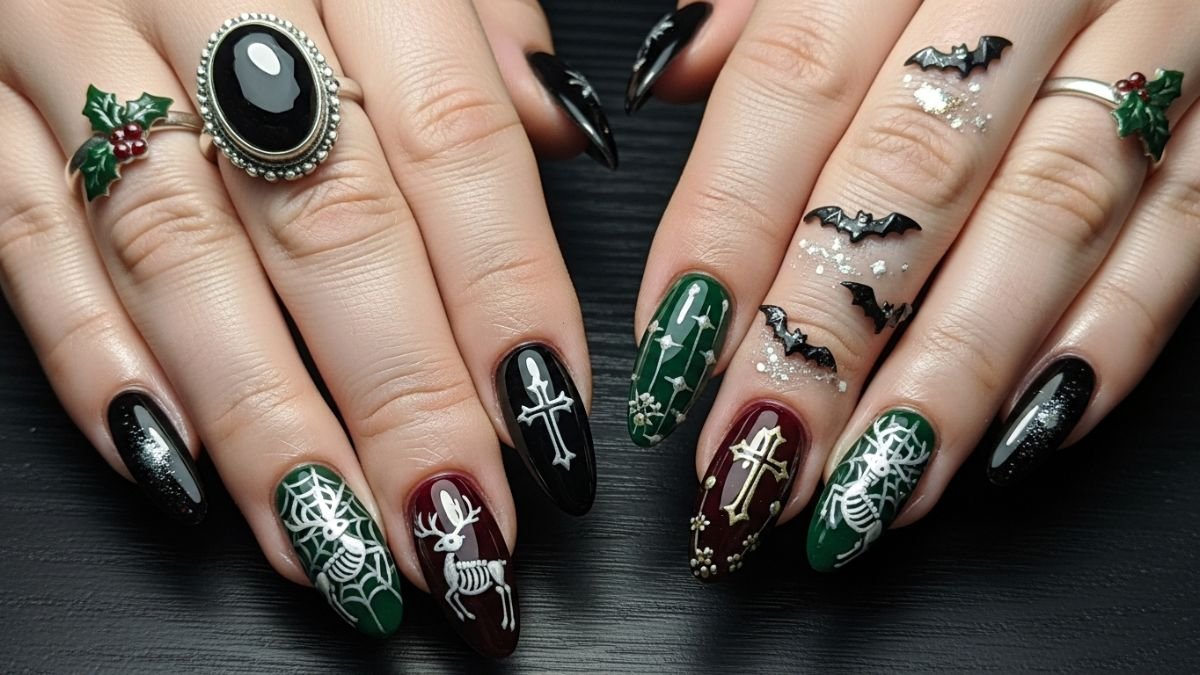 Here are the top 16 goth Christmas nails that blend dark elegance with festive charm:
