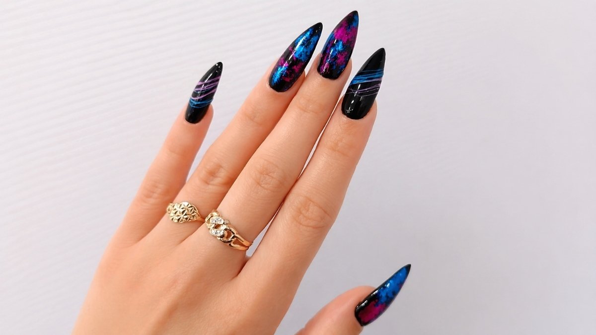 Turn up the rebellion on extra-long stiletto nails with abstract splatter art in electric blue and neon pink. Black bases give depth to this high contrast nail look while metallic touches add dimension. Every finger feels like a fresh graffiti wall in this Jinx nails creation.