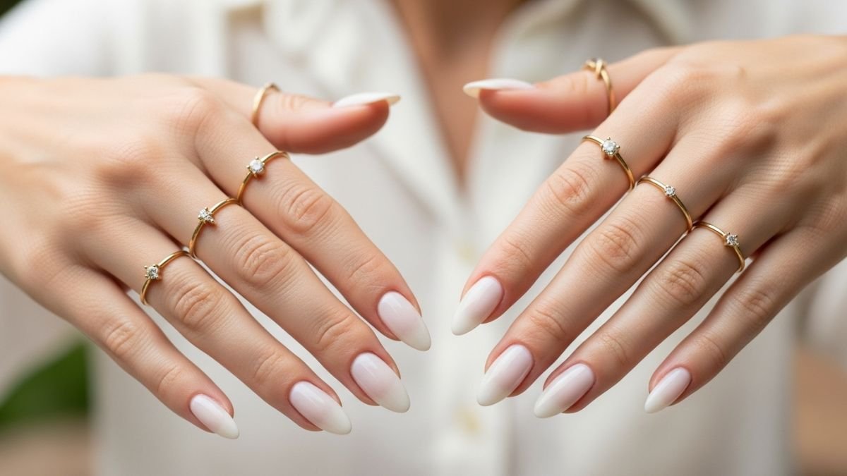 Milky white nails with gentle marbled patterns create an artistic effect. Combine with soft pink eyeliner and pearl-studded rings. Light nude lipstick keeps the focus on nails.