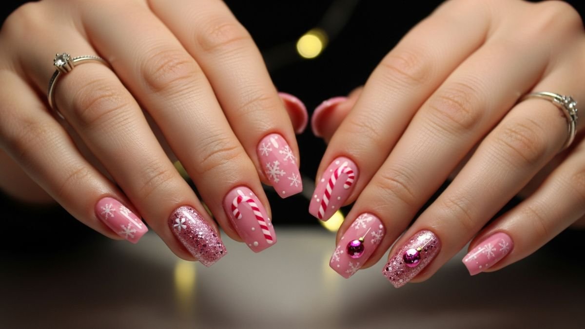 Every nail has its own holiday story. One sparkles with pink glitter, another shows candy-cane stripes, and one has a small ornament drawn neatly.