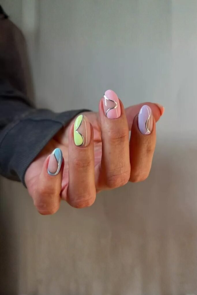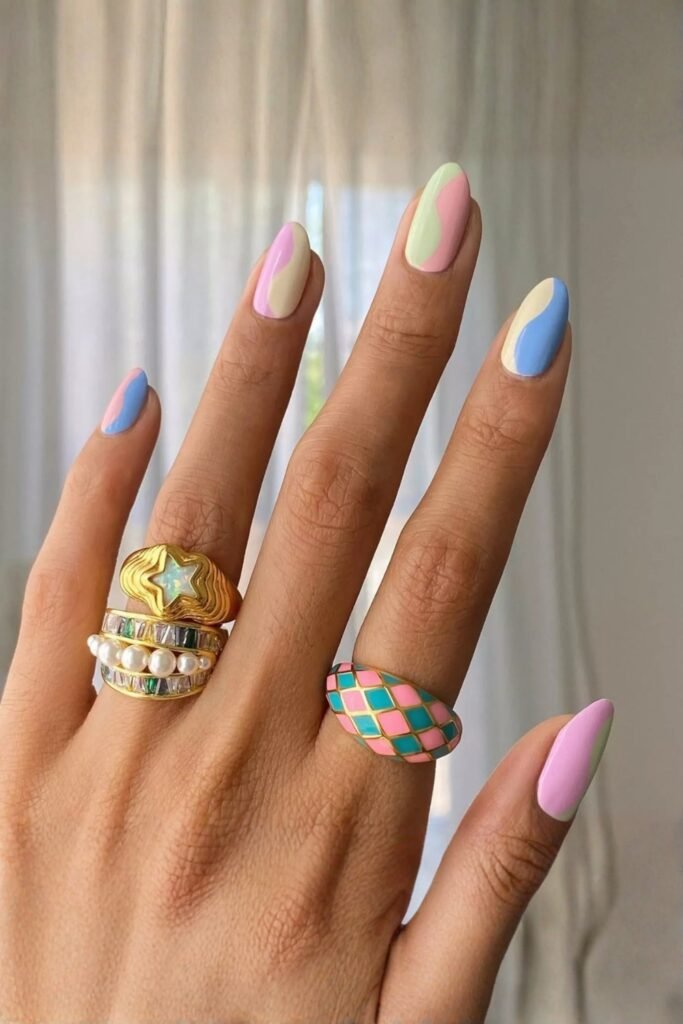 Pastel swirls create a dreamy, soft effect with flowing lines in gentle colors. The design feels free-spirited, like a watercolor painting, and adds a calming, artistic touch to your nails.