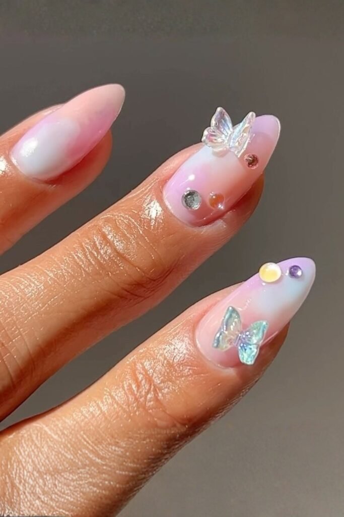 Butterfly decals add a whimsical touch to your Easter nails, bringing color and movement to your fingertips. The delicate butterflies come in soft hues, contrasting beautifully against pastel backgrounds.