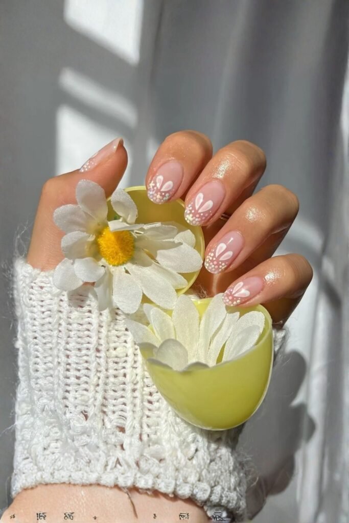 A simple pastel base with small, white flower accents or tiny gold dots is perfect. It’s minimal, elegant, and gives just the right amount of Easter charm without being too bold.