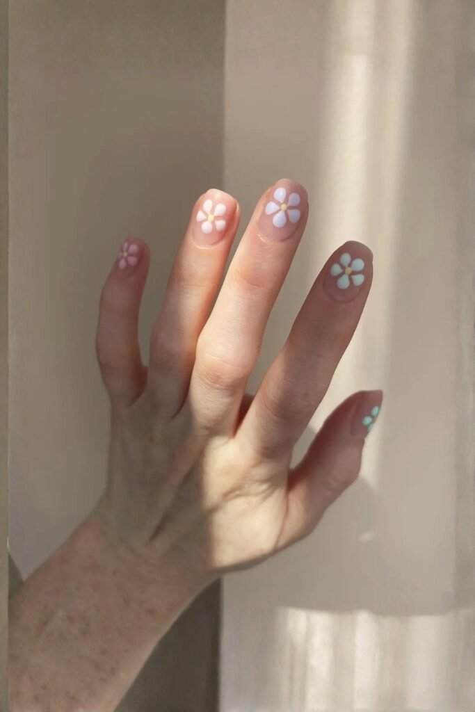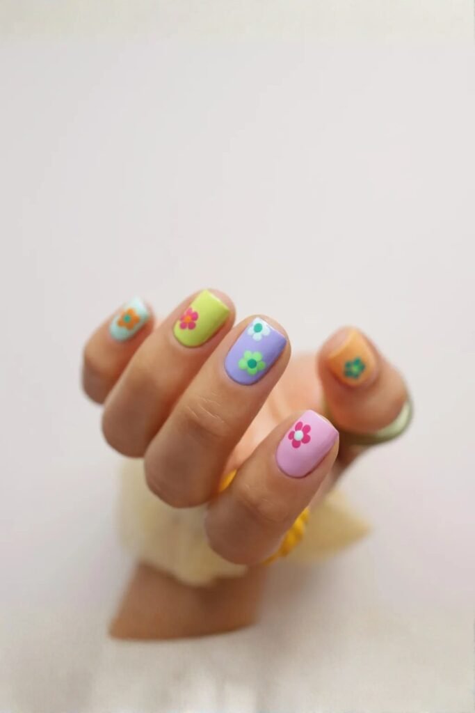 The pastel rainbow daisy mani combines soft colors with playful floral patterns, bringing a cheerful vibe to your nails. Each finger gets a different pastel shade, highlighted by delicate daisies.
