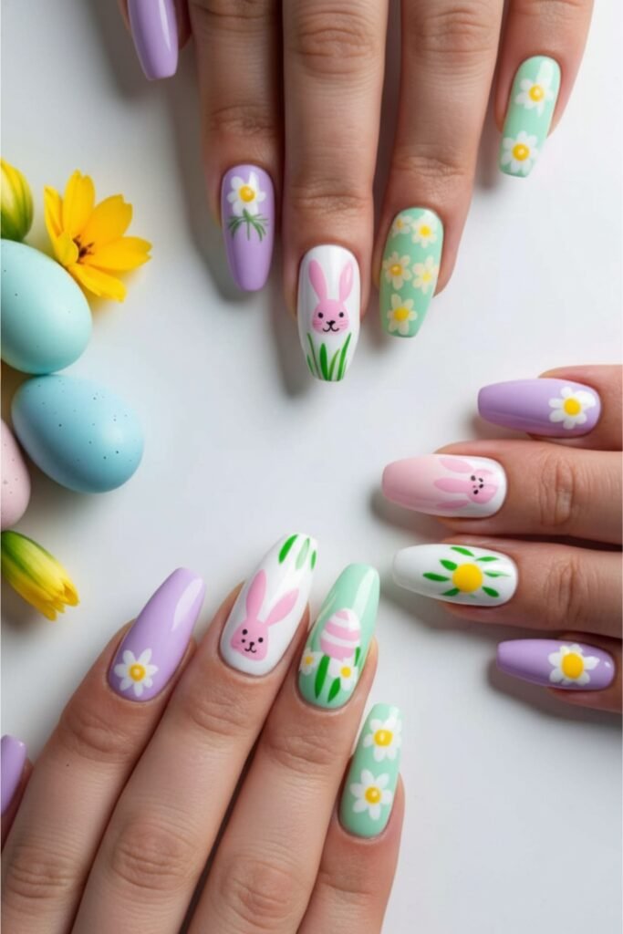 Pastels are perfect for subtle Easter nails. Soft pinks, mint greens, lavender, baby blue, and creamy whites create a gentle, spring-inspired look that is ideal for the season.