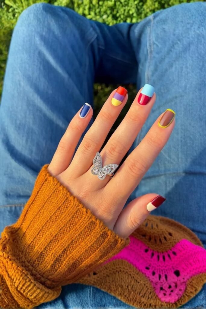 This design feels light and carefree, perfect for those who enjoy vibrant, cheerful colors. A glossy finish keeps the look fresh and playful, while a top coat adds protection for long-lasting wear.