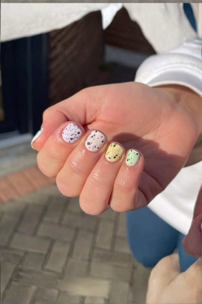 Mini egg nails capture the essence of Easter in the most adorable way. The design mimics the colorful, speckled look of Easter eggs, with tiny dots and pastel tones.
