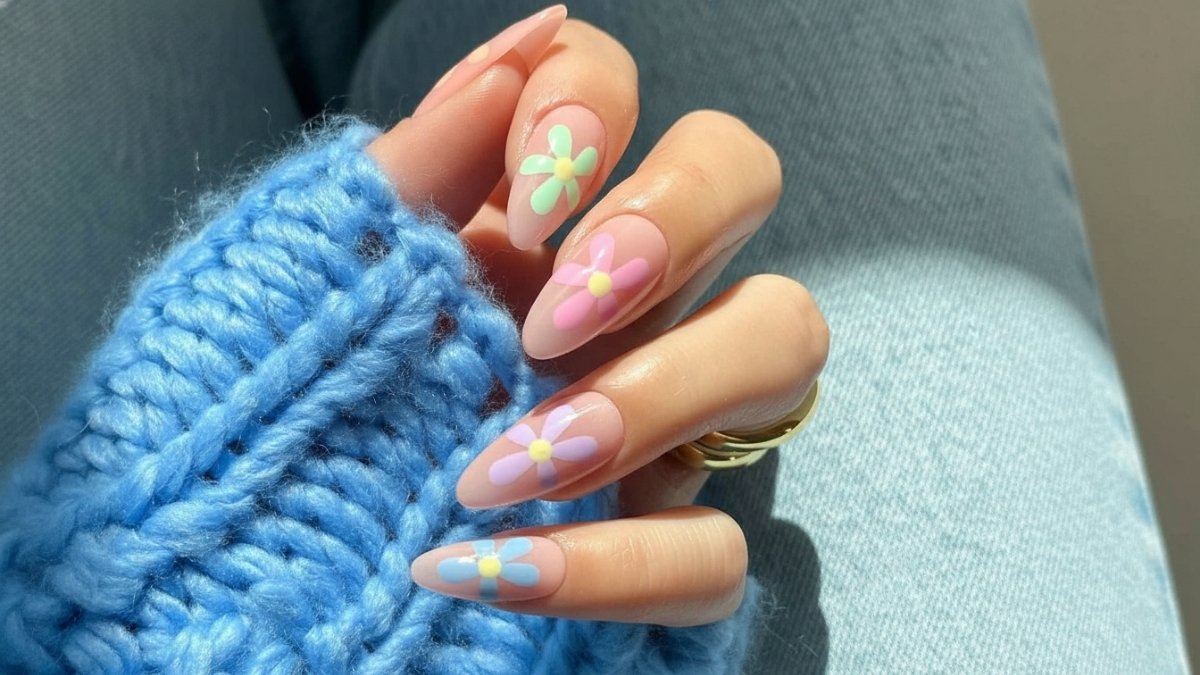 The pastel rainbow daisy mani combines soft colors with playful floral patterns, bringing a cheerful vibe to your nails. Each finger gets a different pastel shade, highlighted by delicate daisies.
