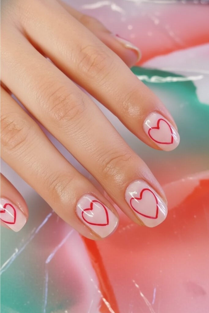 This design proves that short nail designs can still feel romantic and stylish. Short square nails feature a nude pink base with tiny red heart accents placed near the corners for a soft Valentine effect. The glossy short nails add elegance while keeping the look practical.