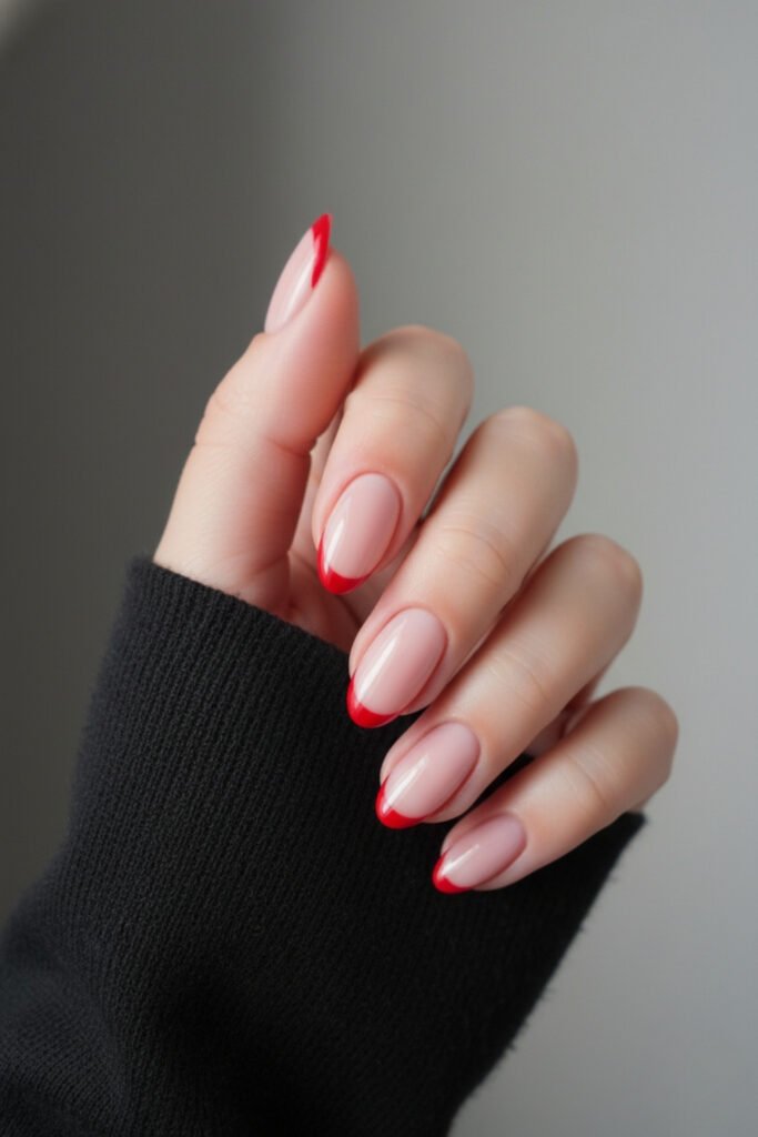 This design highlights how red short nails can remain subtle and elegant. Short square nails feature a nude base with tiny red tips and minimal heart nail art for a romantic finish. The glossy short nails keep the look refined and feminine.