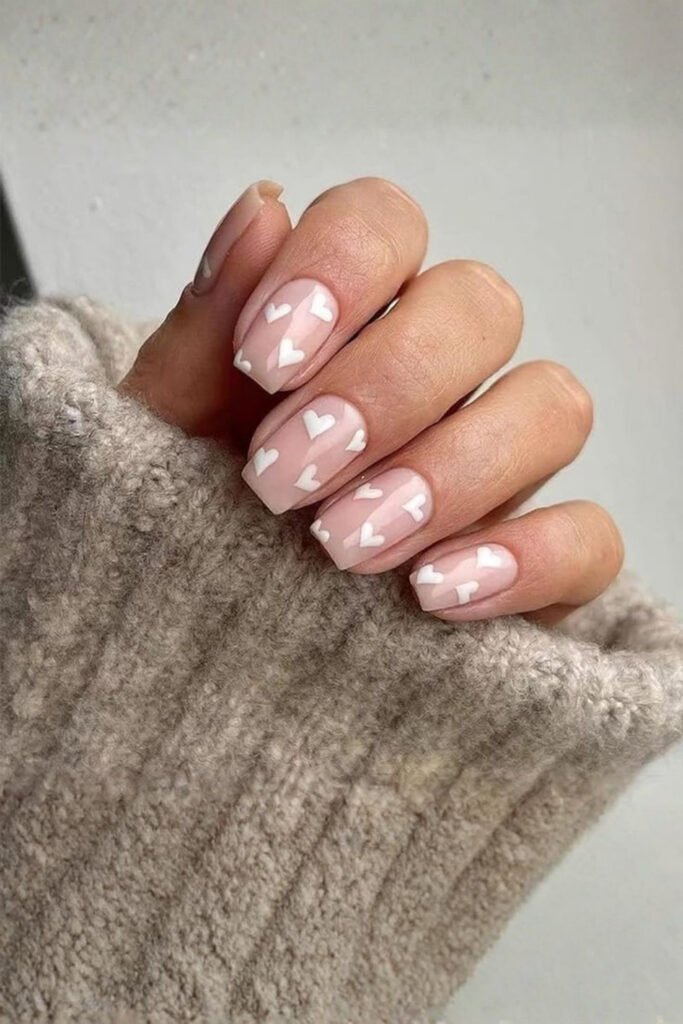 This design shows how minimal nail art can still feel romantic and special. Short round nails feature a nude base with tiny white heart nail art placed gently near the cuticles. The glossy short nails keep the look polished and refined.