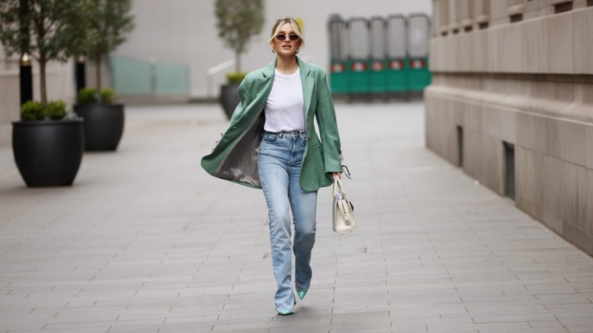 Throw on a structured blazer to add balance and create a sleek, put-together look. Gigi Hadid has been seen in this minimal yet powerful denim ensemble, and you can make it yours with a winged liner, a nude matte lip, and gold hoops.
