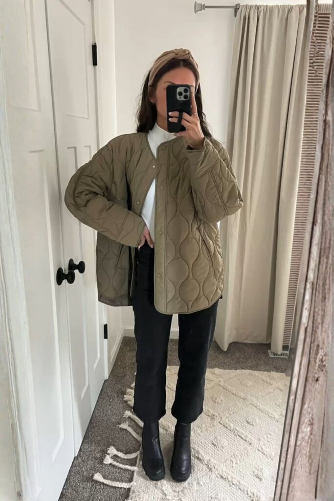 A quilted jacket is a must for cold and chilly spring outfit ideas summer—providing warmth without bulk. Layer it over a fitted long-sleeve top and straight-leg jeans for a modern spring look that’s both functional and stylish.