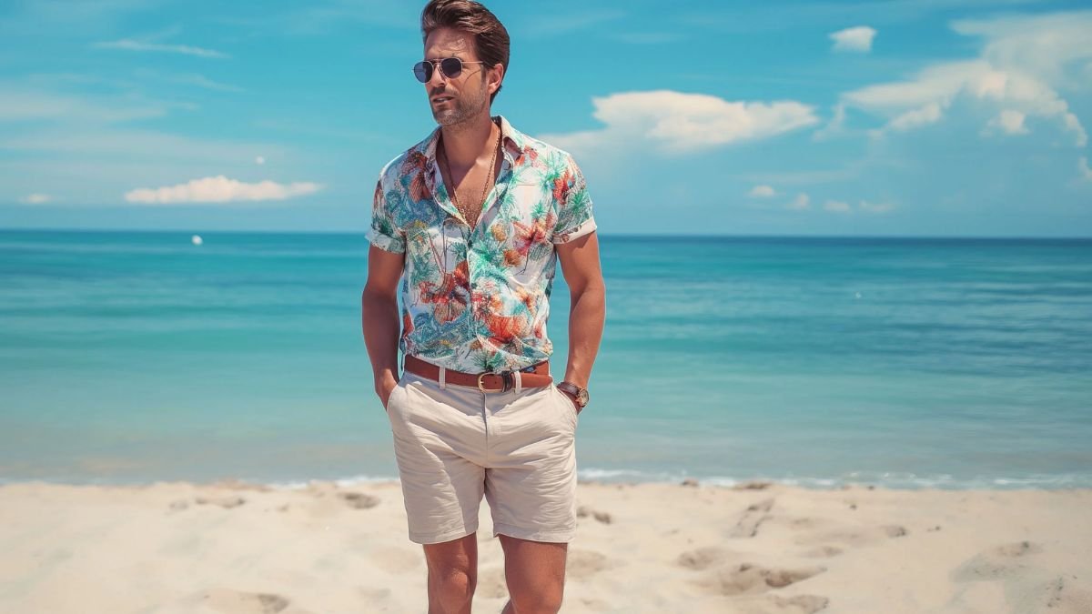 A printed vacation shirt in coral or teal sets a fun tone. Pair it with fitted black swim shorts to keep things grounded.