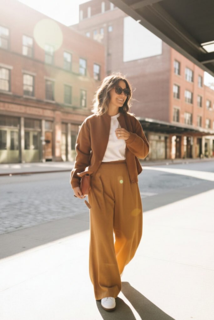 Chunky loafers or vintage sneakers keep it comfortable, while a crossbody leather bag and delicate gold jewelry elevate the look. Soft bronzed eyes and a natural pink lip complement this effortless layering trend.