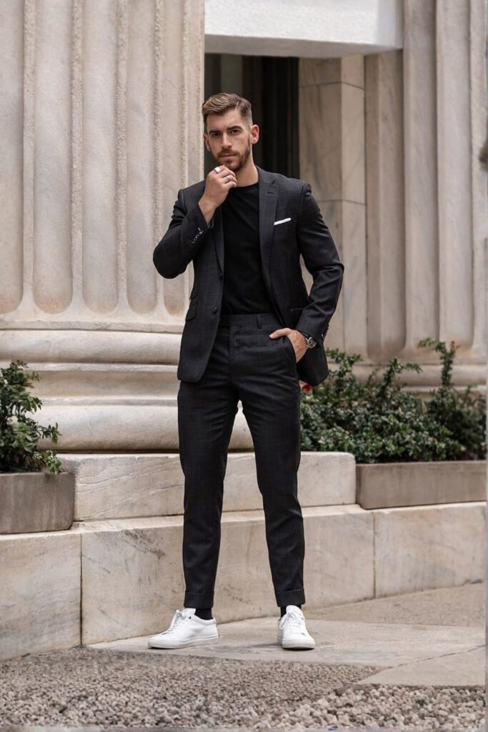 4) Gray Suit with Pastel Shirt & White Sneakers