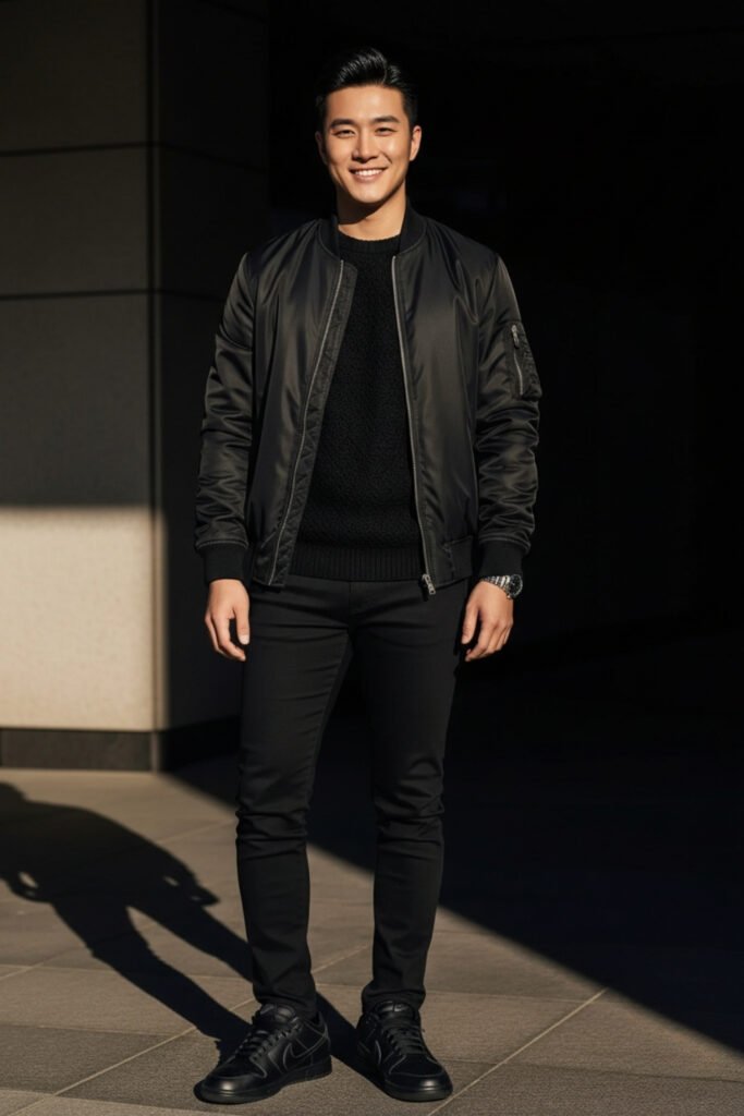 14) Black Jeans, Dress Shirt & Lightweight Bomber