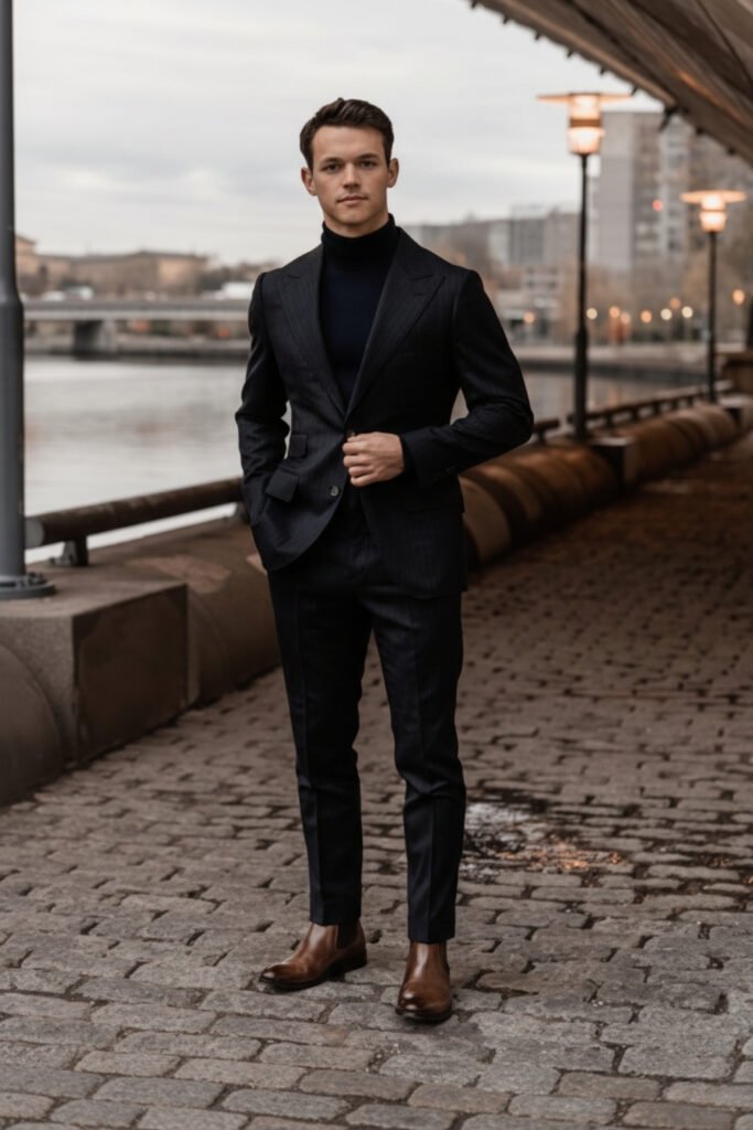 This luxe combo screams sophistication. A double-breasted suit in navy or gray over a black turtleneck brings that elevated men’s fashion for graduation energy. Add dark brown brogues, a silver tie pin, and a leather band watch.