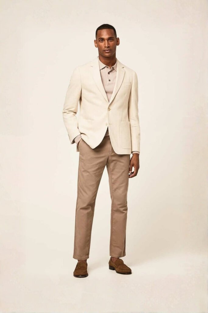 Nothing says summer like linen. Go for beige or off-white linen pants with a matching open-collar short-sleeve shirt. This breathable fit is great for summer graduation outfit ideas for men, especially outdoors.