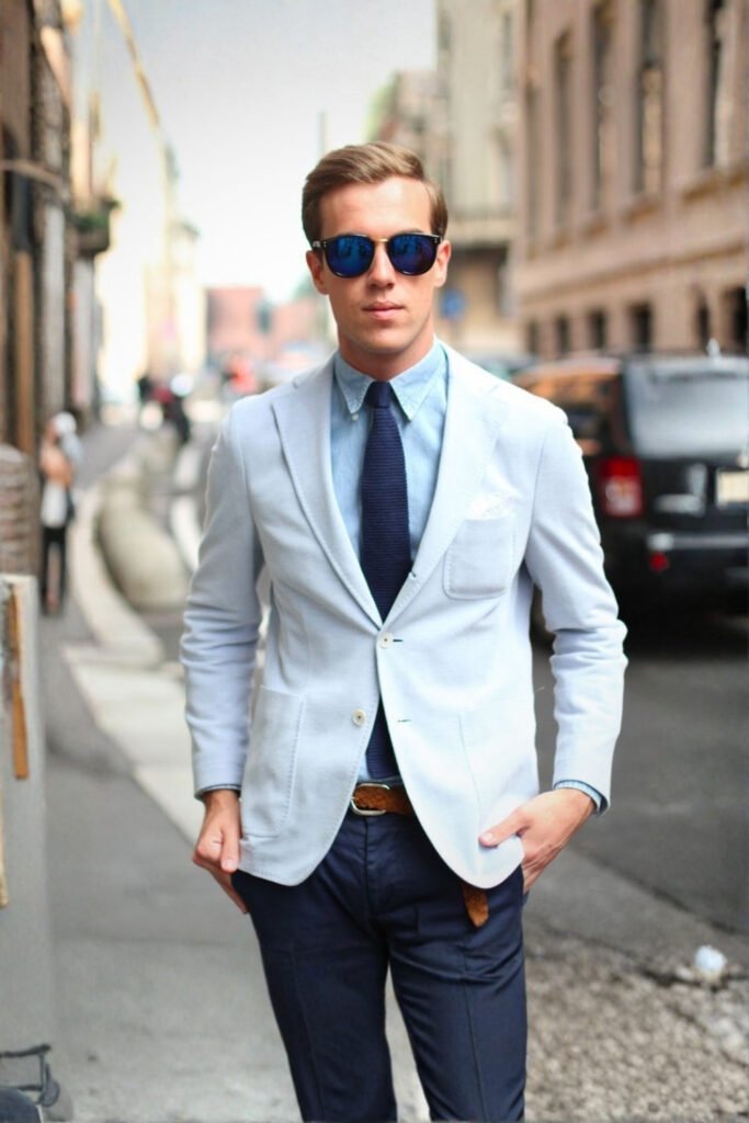 9) Light Blue Shirt, Navy Pants, and White Blazer
