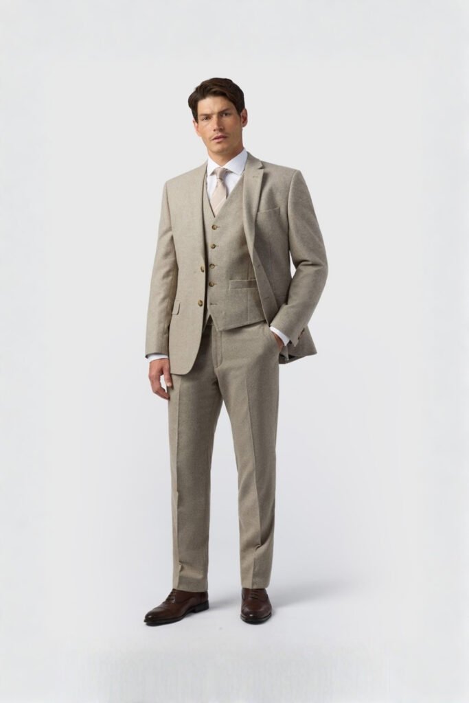 Soft, neutral, and photo-perfect—this graduation outfit for men feels fresh. A tailored tan or beige suit pairs with a white dress shirt left open at the collar. Slide on suede loafers, a leather bracelet, and a subtle gold chain.