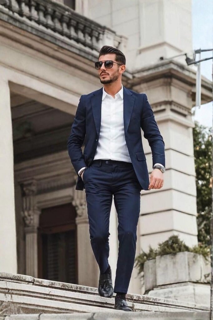 This classic college graduation outfit idea for men mixes polish with personality. A navy slim-fit suit, crisp white dress shirt, and brown leather loafers make a sharp, timeless look. Add a skinny tie or go tieless with a chain necklace for a trendy twist.