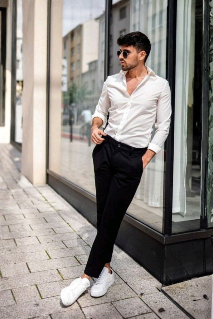 This minimalist look focuses on crisp contrast and street-style flair. Grab a white Oxford shirt, tapered black dress pants, and fresh designer sneakers. Top it off with a silver chain and a small hoop earring for attitude.