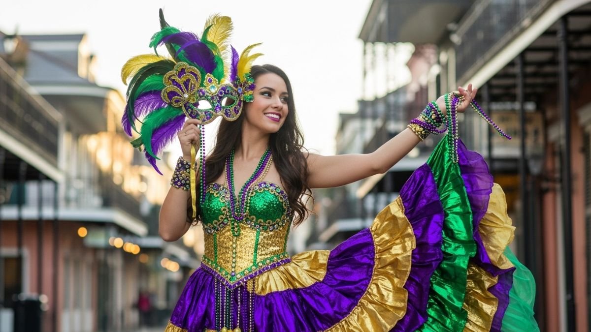 A Mardi Gras outfit for women blends tradition with modern style, featuring purple, green, and gold hues, sequins, feathers, and statement accessories.